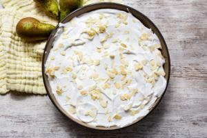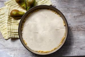 Alle weiteren Zutaten für die Füllung in den Mixtof geben und 15 Sek. / Stufe 4 vermischen. Pudding hinzufügen und weitere 10 Sek. / Stufe 4 vermischen und über die Birnen geben.