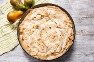 Birnenkuchen mit Baiser-Mandel-Haube mit dem Thermomix gebacken im der runden Stoneware von The Pampered Chef