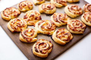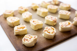 Blätterteig längs aufrollen, in 2,5 cm breite Scheiben schneiden und diese auf den Zauberstein (muss nicht gefettet werden) oder ein mit Backpapier belegtes Backblech legen.