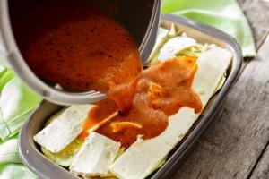 Backofen auf 210°C O-/U-Hitze vorheizen. Währenddessen Lasagneplatten nach Packungsbeilage vorkochen.